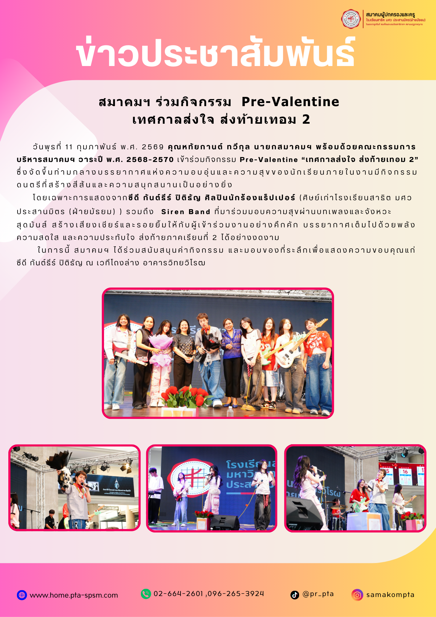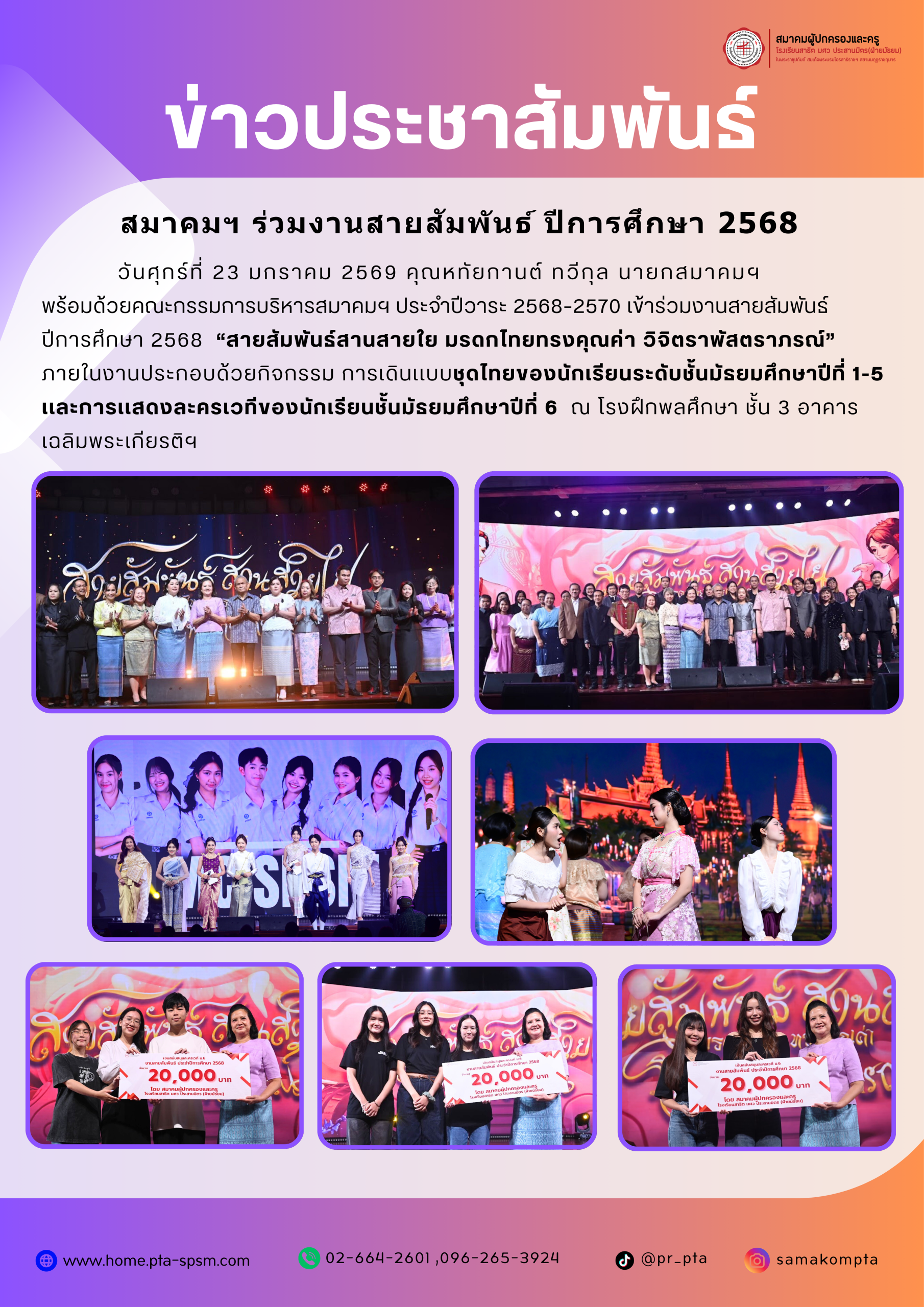 สมาคมผู้ปกครองและครู โรงเรียนสาธิต มศว ประสานมิตร (ฝ่ายมัธยม) ก่อตั้งเมื่อ พ.ศ. 2518 เพื่อสร้างความเข้าใจและแลกเปลี่ยนความรู้ระหว่างผู้ปกครองและครู สนับสนุนการมีส่วนร่วม ในกิจกรรมของโรงเรียน ส่งเสริมความร่วมมือ ด้านการศึกษา ศิลปวัฒนธรรม และกิจกรรมต่าง ๆ ช่วยเหลือพัฒนาจริยธรรม แก้ปัญหานักเรียน ส่งเสริมสวัสดิการของนักเรียนและสมาชิก รวมถึงร่วมมือกับองค์กรภาครัฐและเอกชนเพื่อพัฒนาความรู้ พฤติกรรม สุขภาพ และสวัสดิการ และสนับสนุนการดำเนินงานของโรงเรียน