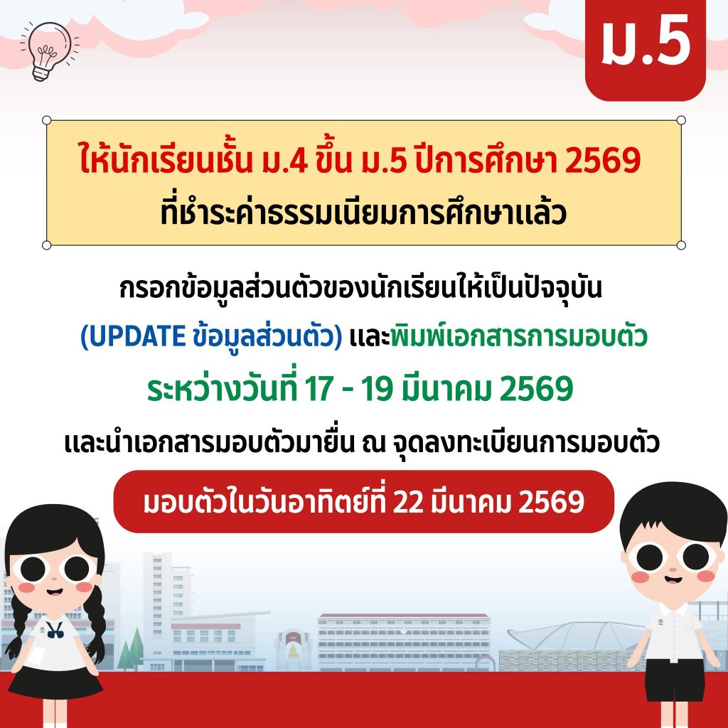 การกรอกข้อมูลสำหรับนักเรียน ม.4 ขึ้น ม.5 ปีการศึกษา 2569 ระหว่างวันที่ 17 – 19 มีนาคม 2569by satit17 มีนาคม 202617 มีนาคม 2026