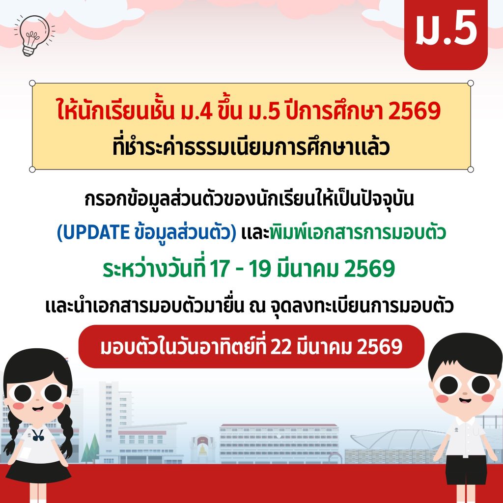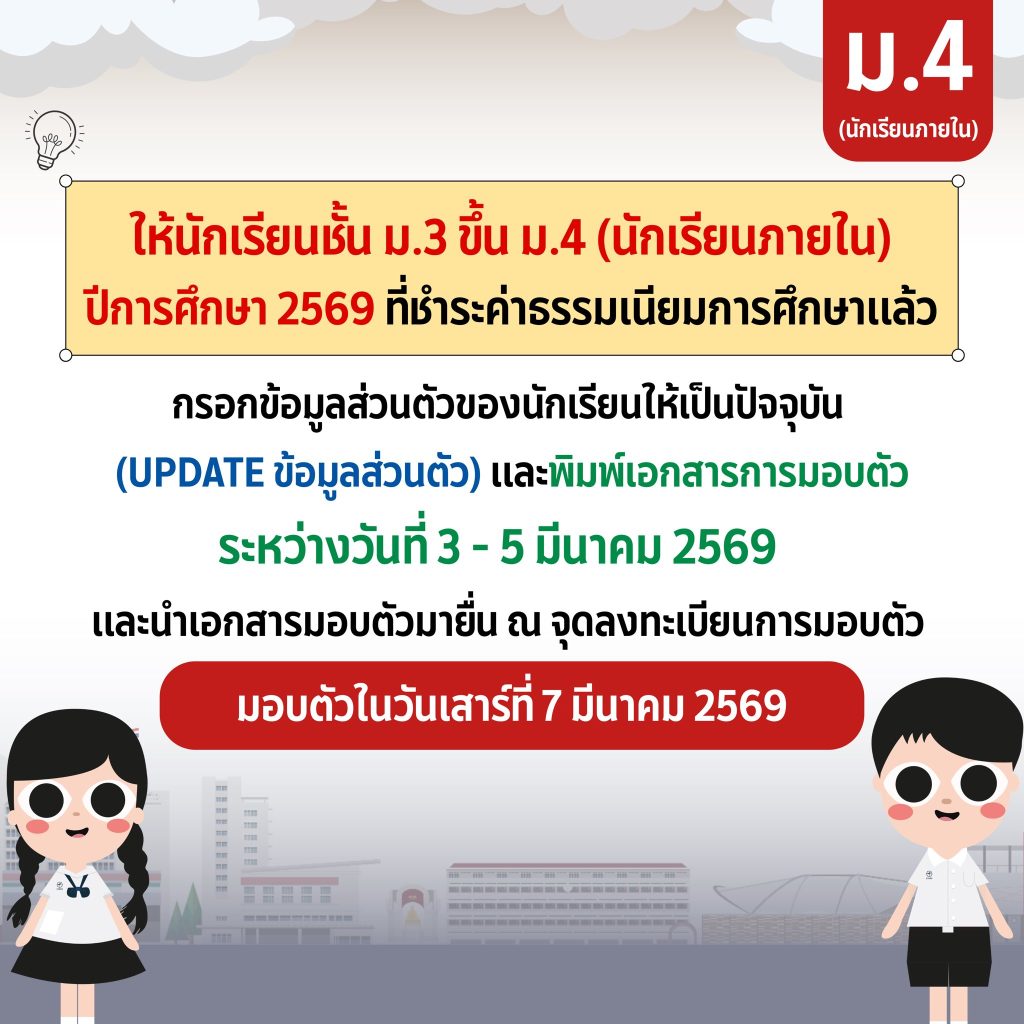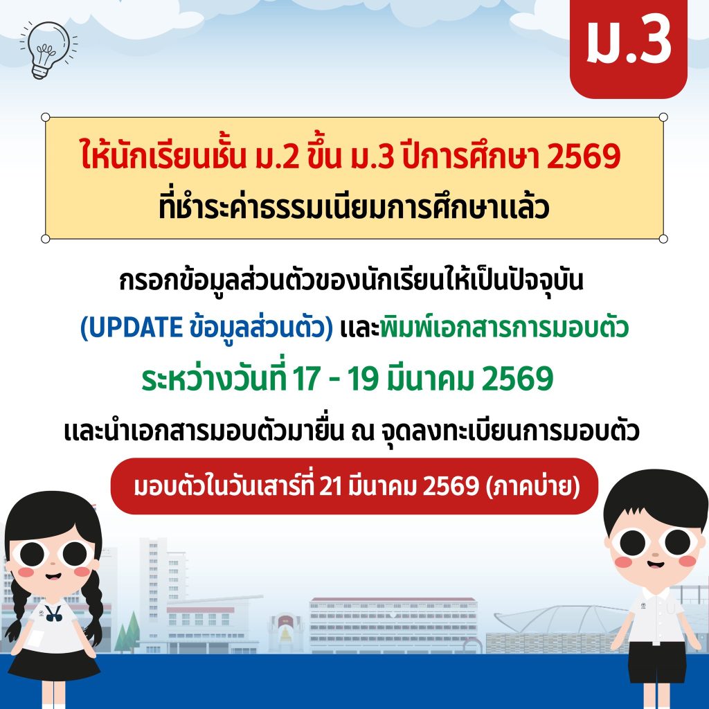 กำหนดการกรอกข้อมูลส่วนตัวนักเรียนby satit24 กุมภาพันธ์ 202624 กุมภาพันธ์ 2026 สำหรับนักเรียนระดับชั้น ม.2 ม.3 ม.4 ม.5 และ ม.6 ที่ได้ชำระค่าธรรมเนียมการศึกษาเรียบร้อยแล้ว