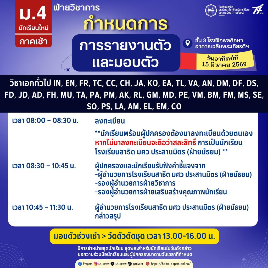กำหนดการรายงานตัวและมอบตัว นักเรียนชั้น ม.4 (บุคคลภายนอก)