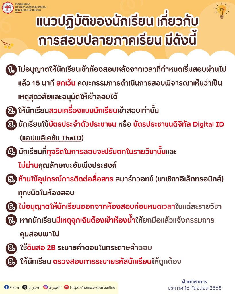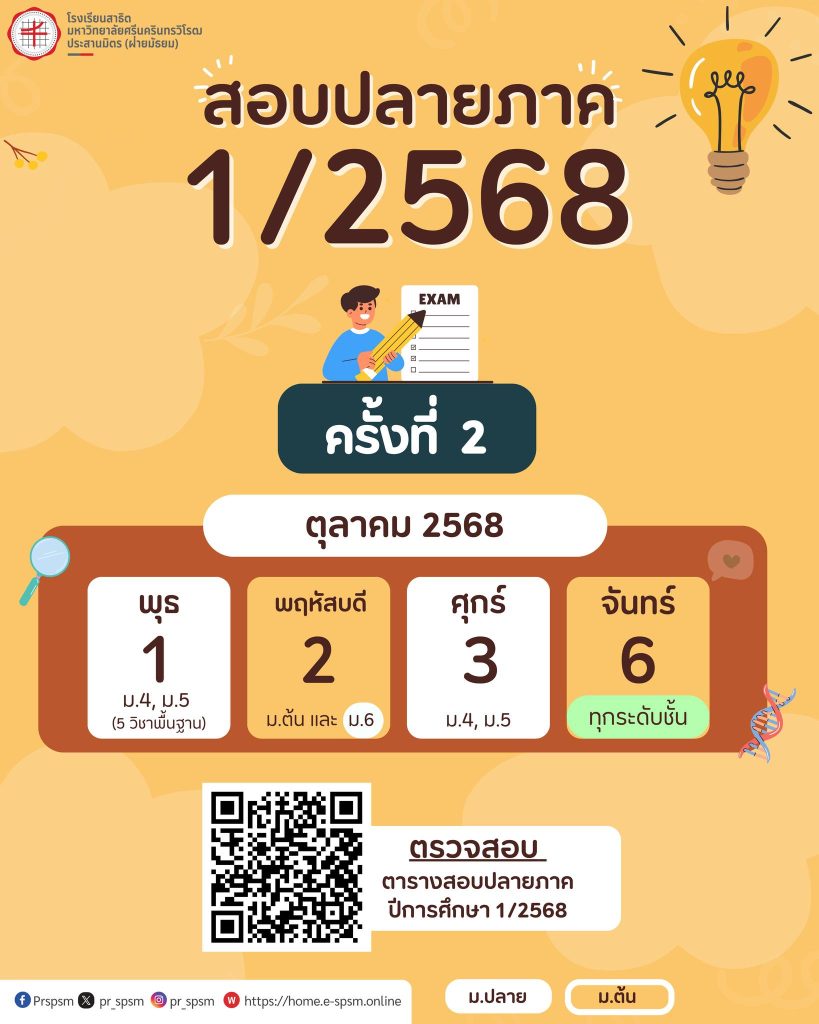 สอบปลายภาคเรียนที่ 1 /2568 ครั้งที่ 2by satit26 กันยายน 202526 กันยายน 2025 ม.ต้น และ ม.ปลาย วันที่ 1 – 3 และ 6 ตุลาคม 2568 ตารางสอบเพิ่มเติม : https://home.e-spsm.online/studenttable-exam/