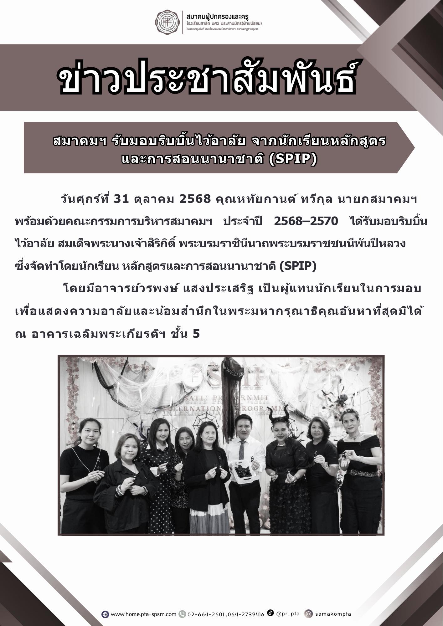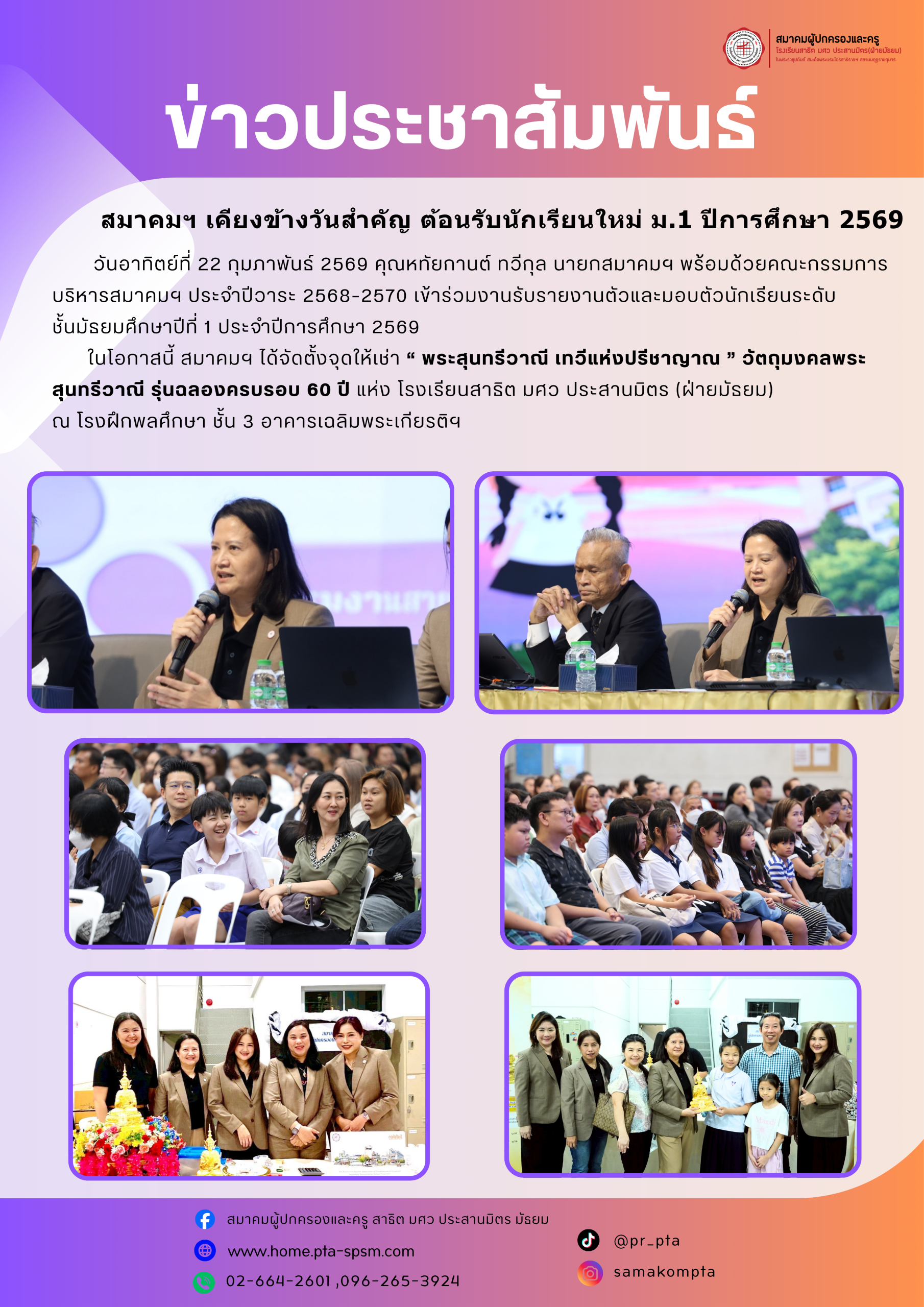 สมาคมผู้ปกครองและครู โรงเรียนสาธิต มศว ประสานมิตร (ฝ่ายมัธยม) ก่อตั้งเมื่อ พ.ศ. 2518 เพื่อสร้างความเข้าใจและแลกเปลี่ยนความรู้ระหว่างผู้ปกครองและครู สนับสนุนการมีส่วนร่วม ในกิจกรรมของโรงเรียน ส่งเสริมความร่วมมือ ด้านการศึกษา ศิลปวัฒนธรรม และกิจกรรมต่าง ๆ ช่วยเหลือพัฒนาจริยธรรม แก้ปัญหานักเรียน ส่งเสริมสวัสดิการของนักเรียนและสมาชิก รวมถึงร่วมมือกับองค์กรภาครัฐและเอกชนเพื่อพัฒนาความรู้ พฤติกรรม สุขภาพ และสวัสดิการ และสนับสนุนการดำเนินงานของโรงเรียน
